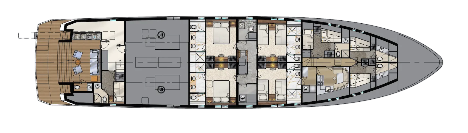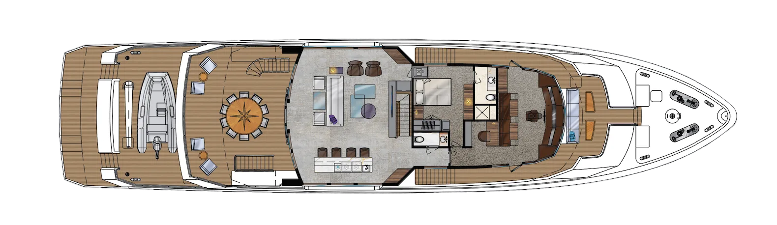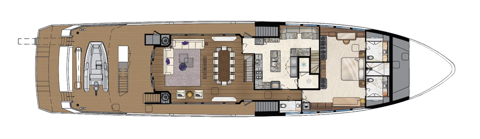 On the main deck, the full-beam owner’s stateroom seems transported from a superyacht. An alcove desk, his-and-her bathrooms and closets – this suite has it all. The galley also is huge, featuring a walk-in refrigerator and freezer, and plenty of space for food prep. It serves a dining area and salon where guests are treated to stunning views through expansive windows. Side decks allow easy crew transit, giving owners and guests privacy when desired.
