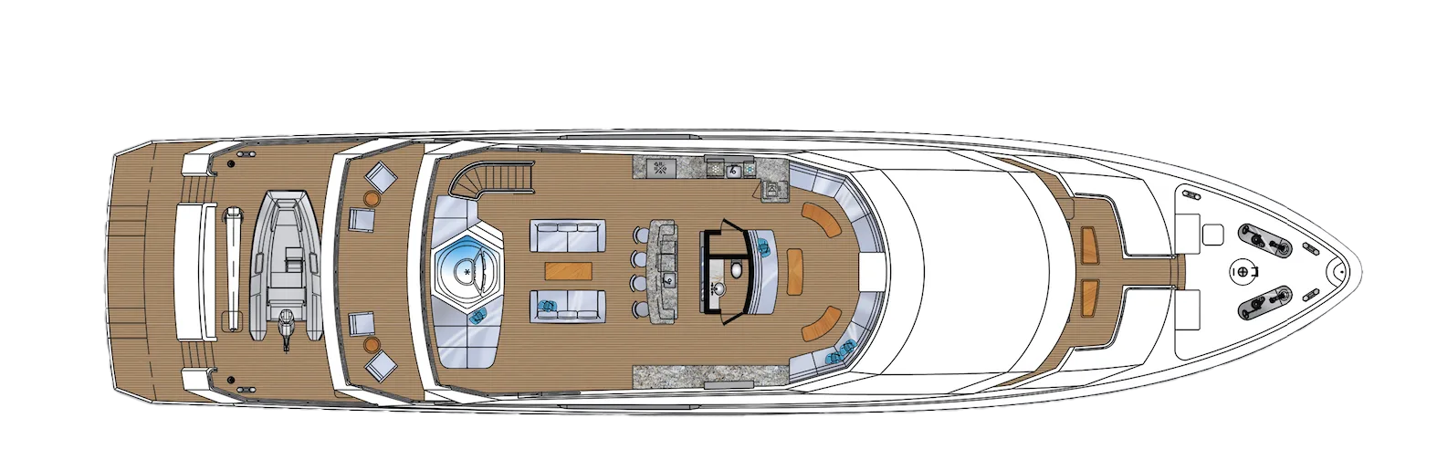 On the sundeck, the hardtop shades an outdoor bar area with two sinks, two refrigerators and BBQ grill, along with a convenient day head. Aft, the Jacuzzi and sunlounge create a spa experience with soaring views.